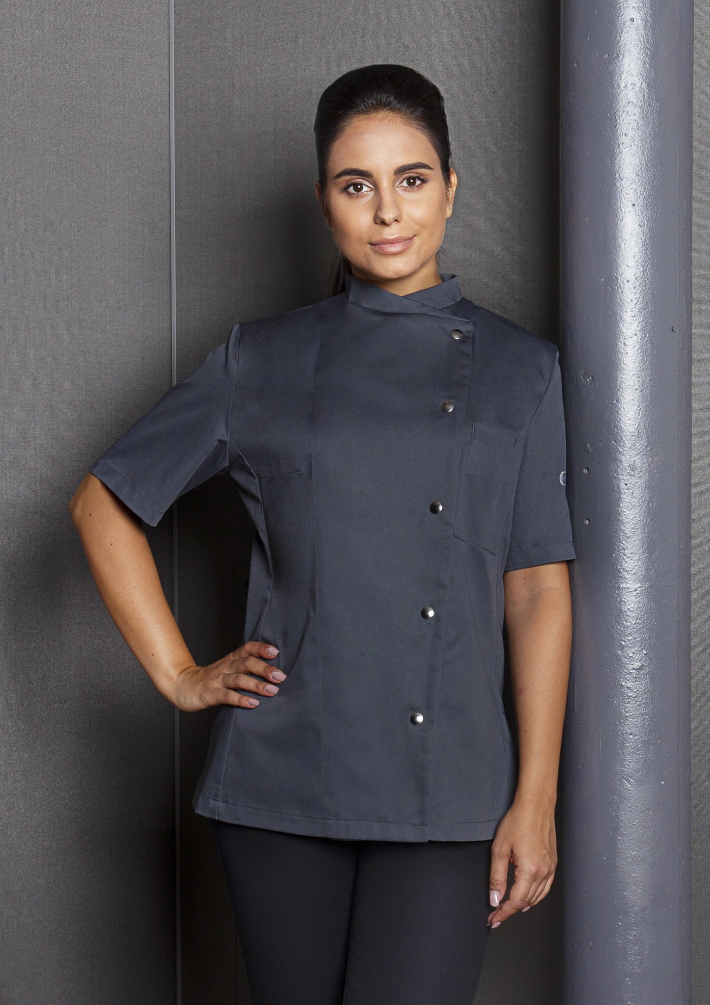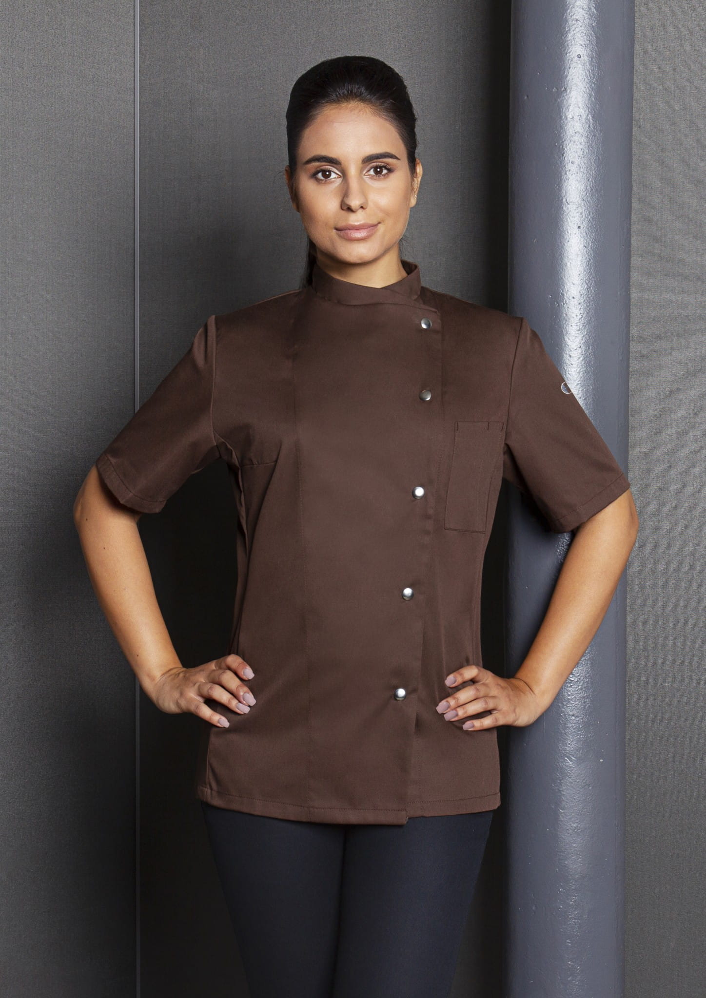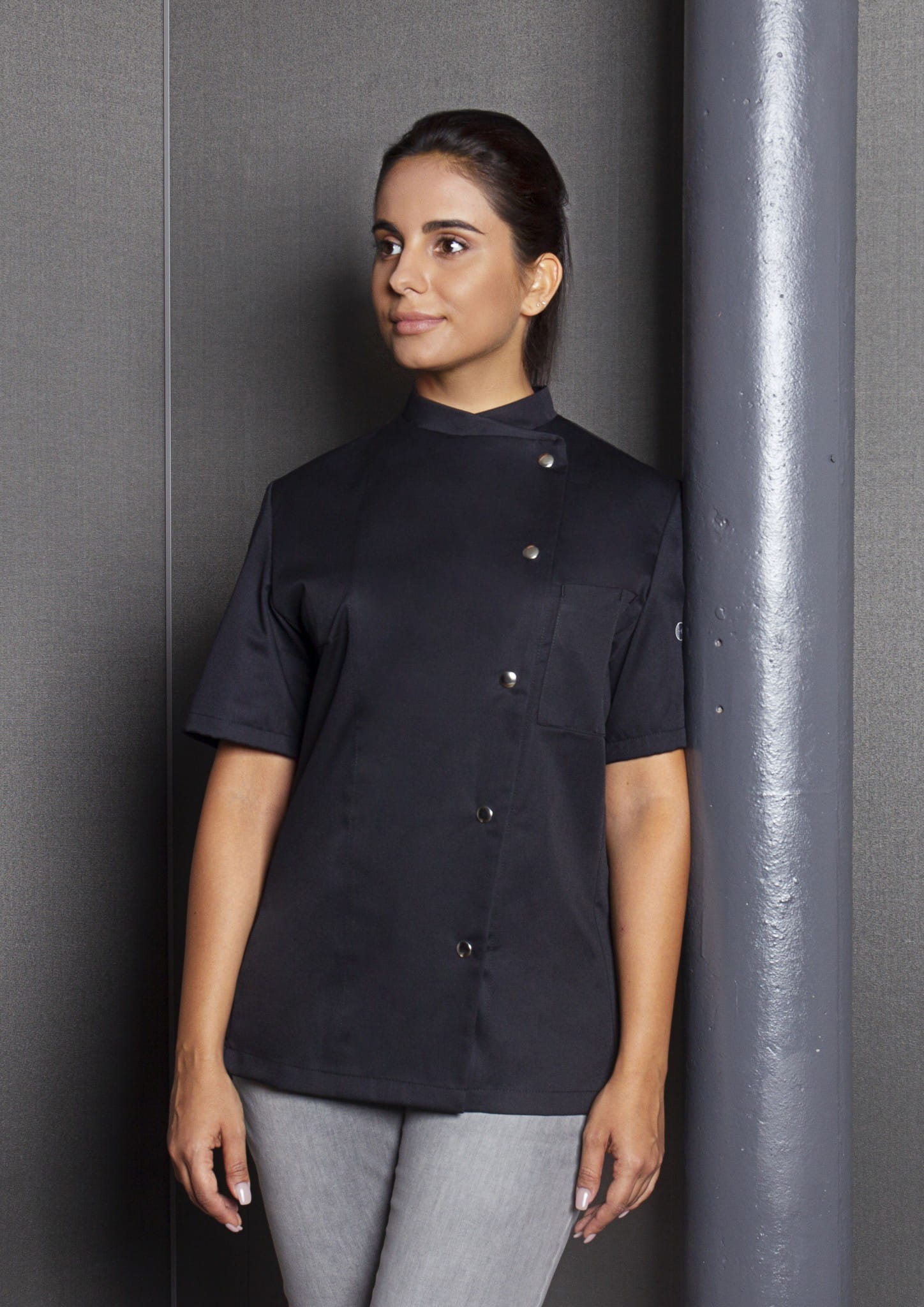 Damska bluza kucharska GRETA firmy KARLOVSKY. Posiada krótki rękaw oraz praktyczną kieszonkę na wysokości klatki piersiowej. Zapięcie w formie pięciu praktycznych, nowoczesnych zatrzasków, które znajduje się po lewej stronie bluzy. Produkt wykonany jest z poliestru 65% oraz bawełny 35% 215 g/m². Tkanina ta wykonana została z wysokogatunkowych włókien, dlatego komfort pracy jest zapewniony nawet w wysokich temperaturach. Ponadto idealnie dopasowuje się do kobiecej sylwetki i jest niezwykle trwała. Ubrania gastronomiczne firmy KARLOWSKY łączą w sobie rewelacyjny wygląd z funkcjonalnością. Ponadto mogą być używane zarówno w restauracjach, jak i w cateringu. Odzież jest trwała i praktyczna.