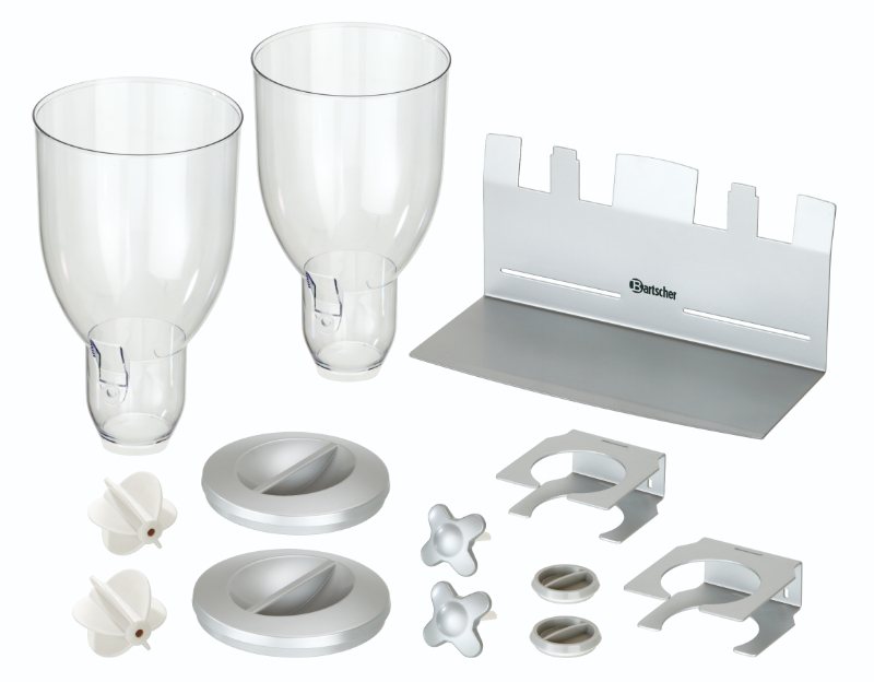 Podwójny dozownik do płatków i musli, idealny do bufetów i stref śniadaniowych, gdzie liczy się szybka obsługa i porządek. Dwa niezależne pojemniki pozwalają serwować różne produkty równocześnie, a wygodne pokrętła umożliwiają precyzyjne porcjowanie (ok. 50 ml na obrót). Pojemniki są odporne na zarysowania, a całość można również zamontować na ścianie.