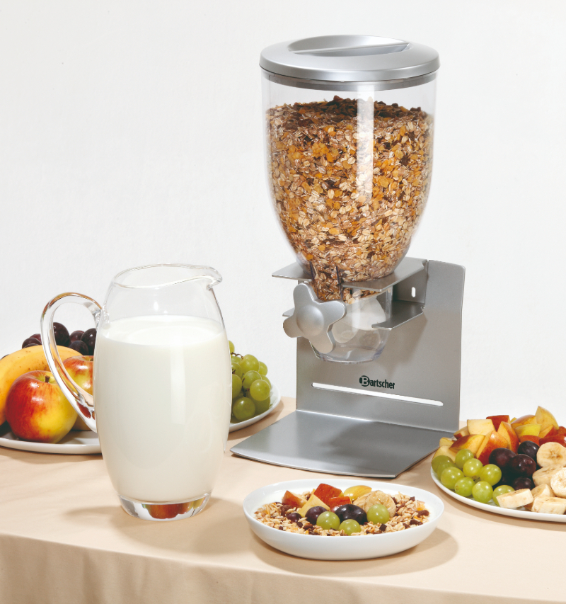 Kompaktowy, pojedynczy dozownik ścienny do płatków śniadaniowych, musli, zbóż i orzechów. Zajmuje minimum miejsca, a porcja jest wydawana jednym ruchem – przez przekręcenie pokrętła (ok. 50 ml na obrót). Pojemnik z tworzywa jest odporny na zarysowania, a obudowa z lakierowanej blachy stalowej dobrze znosi intensywne użytkowanie w gastronomii.