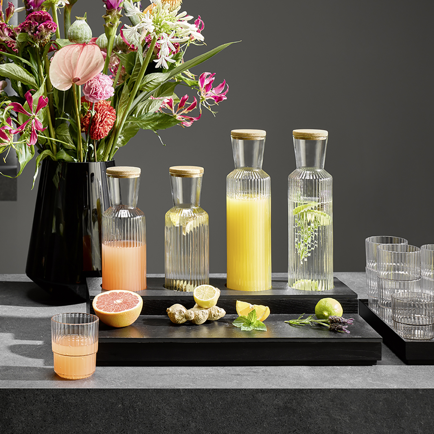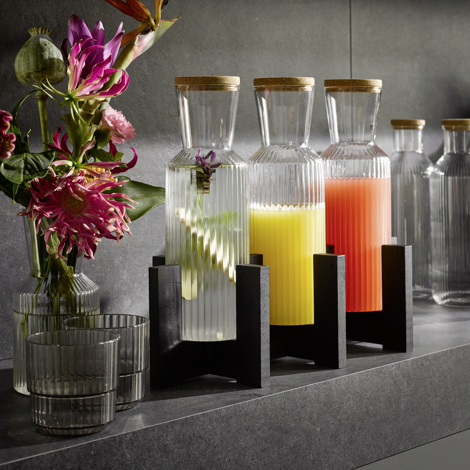 Seria LINES jest idealna do podawania wody, soków, lemoniady, mleka oraz innych napojów – zarówno na stole, jak i w strefie bufetu. Karafki świetnie sprawdzą się także do serwowania płatków śniadaniowych na bufecie, np. musli czy granoli, podanych w estetyczny i higieniczny sposób. Dzięki kompaktowym wymiarom karafki nie zajmują dużo miejsca i łatwo tworzą spójną, estetyczną ekspozycję (również w połączeniu z dedykowanymi stojakami/ekspozytorami, jeśli są stosowane w danym zestawie).