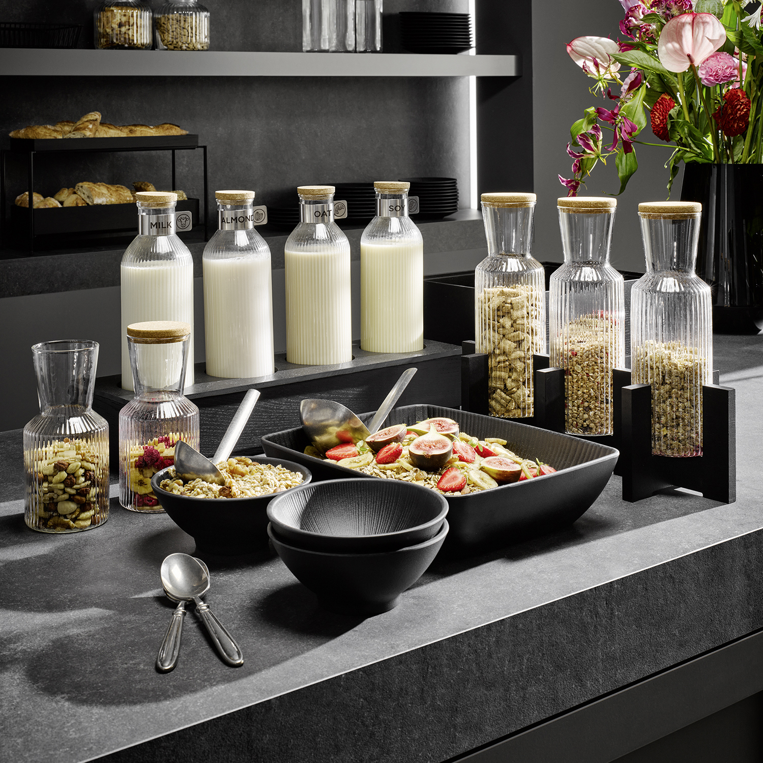 Seria LINES jest idealna do podawania wody, soków, lemoniady, mleka oraz innych napojów – zarówno na stole, jak i w strefie bufetu. Karafki świetnie sprawdzą się także do serwowania płatków śniadaniowych na bufecie, np. musli czy granoli, podanych w estetyczny i higieniczny sposób. Dzięki kompaktowym wymiarom karafki nie zajmują dużo miejsca i łatwo tworzą spójną, estetyczną ekspozycję (również w połączeniu z dedykowanymi stojakami/ekspozytorami, jeśli są stosowane w danym zestawie).