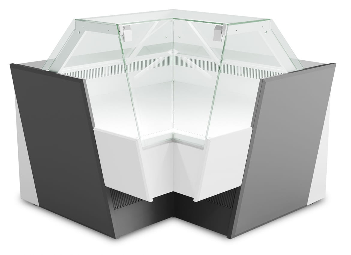 Lada chłodnicza narożna wewnętrzna z kolekcji urządzeń chłodniczych Futura. Produkt marki Bolarus. Lada Futura NW pozwala tworzyć indywidualne ciągi lad chłodniczych, które są dopasowane do wnętrza lokali handlowych oraz gastronomicznych.