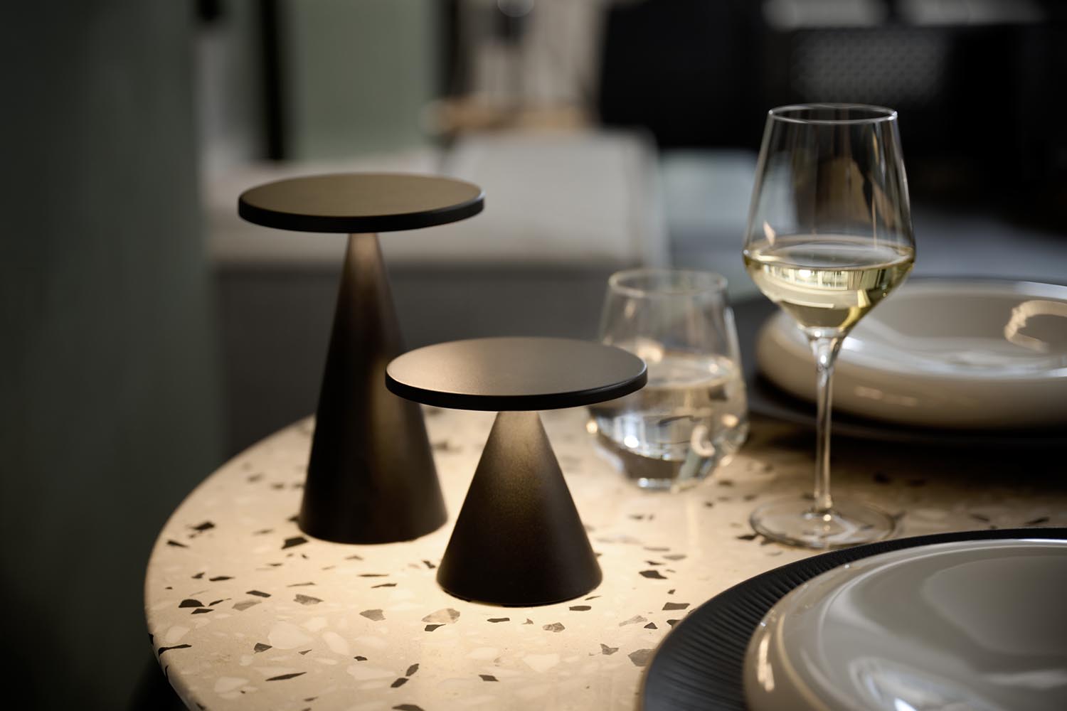 Lampa stołowa CONE marki APS to eleganckie, mobilne oświetlenie dekoracyjne do restauracji, hoteli, kawiarni i stref lounge. Metalowa obudowa i kompaktowa forma świetnie prezentują się na blacie, a 3-stopniowe ściemnianie oraz regulacja temperatury barwowej (CCT) pozwalają szybko dopasować klimat – od ciepłego, nastrojowego światła po jaśniejsze, bardziej neutralne. Wbudowany akumulator umożliwia wygodne użytkowanie bez przewodów, a sterowanie pilotem ułatwia obsługę w sali. Lampa ma także ochronę przed pyłem i bryzgami wody (IP54), dlatego sprawdzi się również w zadaszonych strefach zewnętrznych.