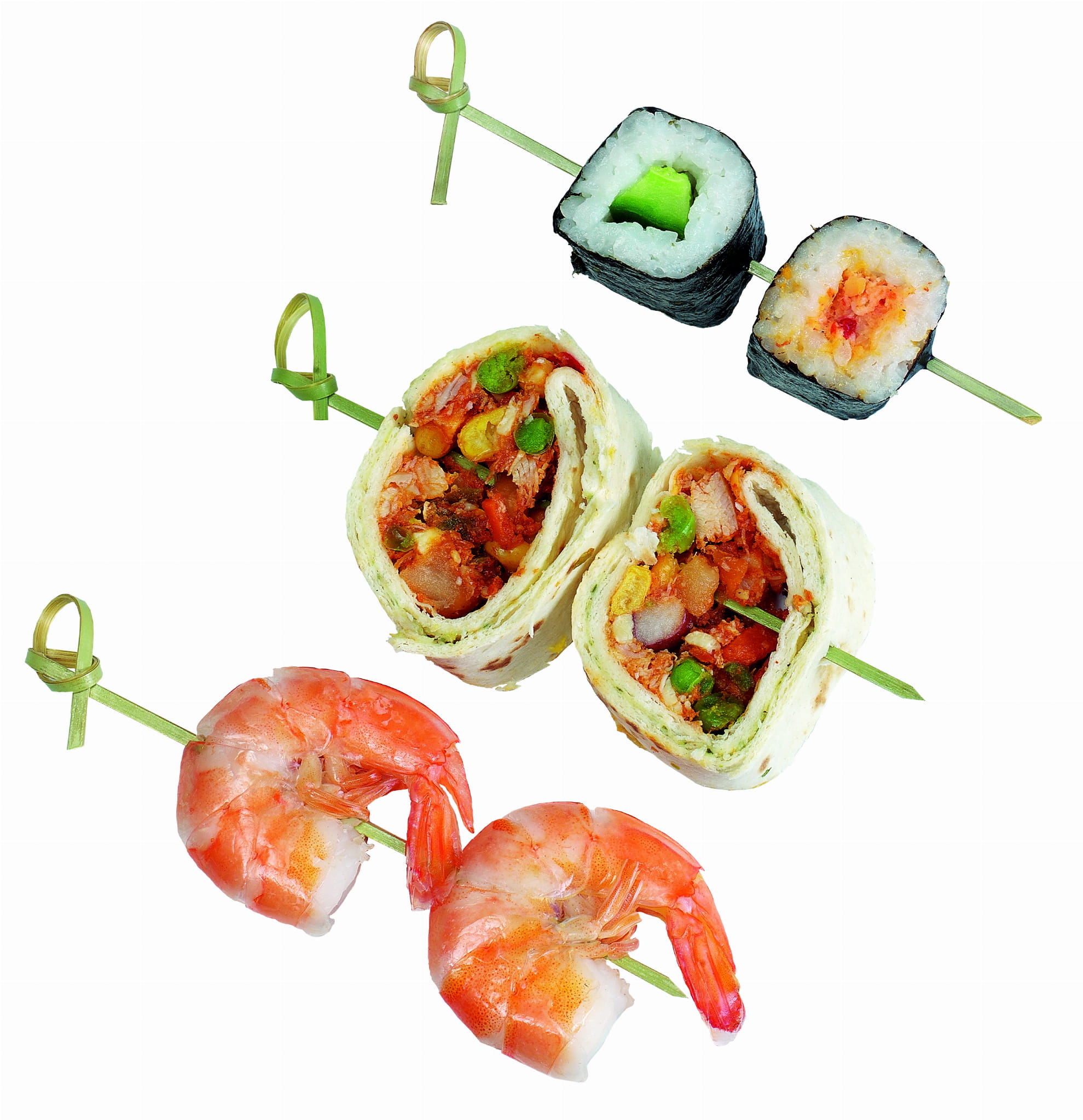 Zestaw wykałaczek bambusowych obejmujący 100 sztuk. Idealnie sprawdzą się do przekąsek czy burgerów, a pętelka na zakończeniu zabezpieczy przed ewentualnym zsunięciem się produktów.