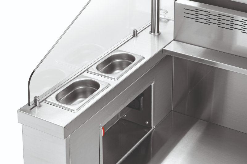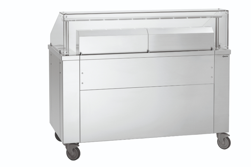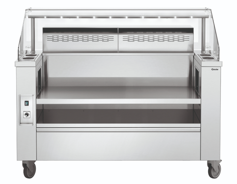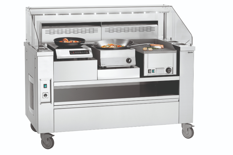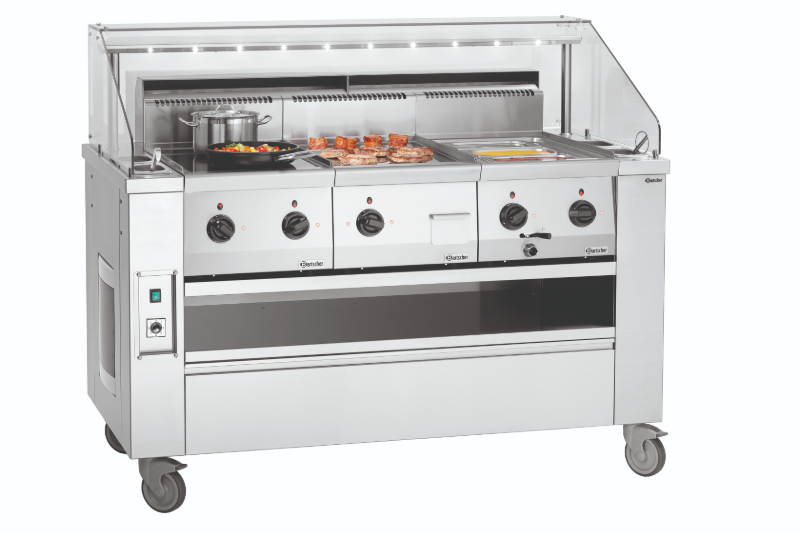 Perfekcyjna, optymalizowana, mobilna stacja do gotowania prezentuje się rewelacyjnie podczas gotowania na oczach gości. Od kuchenki indukcyjnej o mocy 230 V po solidną płytę grillową z serii 650 o mocy 400 V – do tego nawet 3 urządzenia nablatowe, które gwarantują niezwykle wszechstronne zastosowanie w cateringu, na imprezach, a także podczas gotowania na oczach gości. Świetnie sprawdzi się też w street foodach, np. w food truckach. Produkt marki Bartscher posiada oświetlenie LED na osłonie, co jest praktyczne i efektowne. W skład wyposażenia wchodzą: półka do odstawiania pod strefami roboczymi (wymiary: 1200x600x150 mm), 4 pojemniki GN 1/9 GN na oleje i sosy o głębokości 100 mm, sztućce do gotowania, 4 kółka skrętne (w tym dwa z możliwością zablokowania) oraz zintegrowany system wentylacji z filtrem labiryntowym.