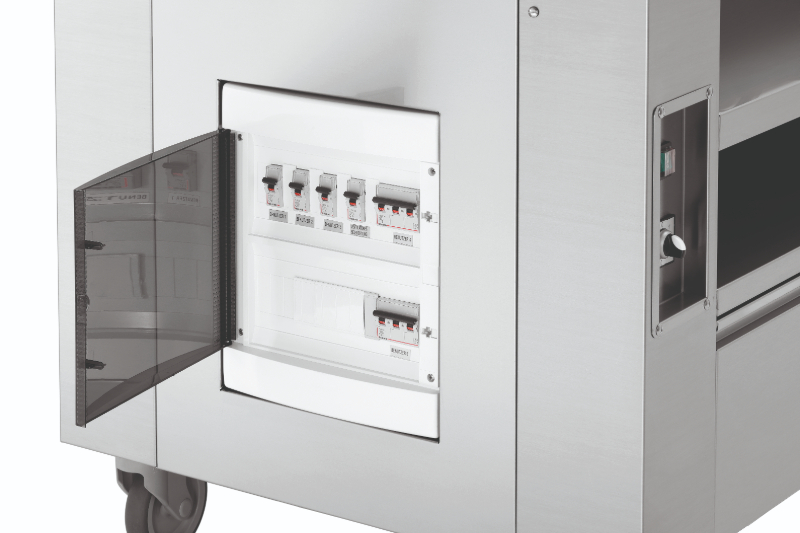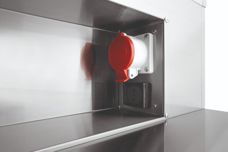 - właściwości wnęki regulowanej: przystosowane do maks. 3 urządzeń nastolnych; powierzchnia do ustawienia o wymiarach 1208x600 mm; 5 gniazd: 3x230 V, 2x400 V 16A CEE.