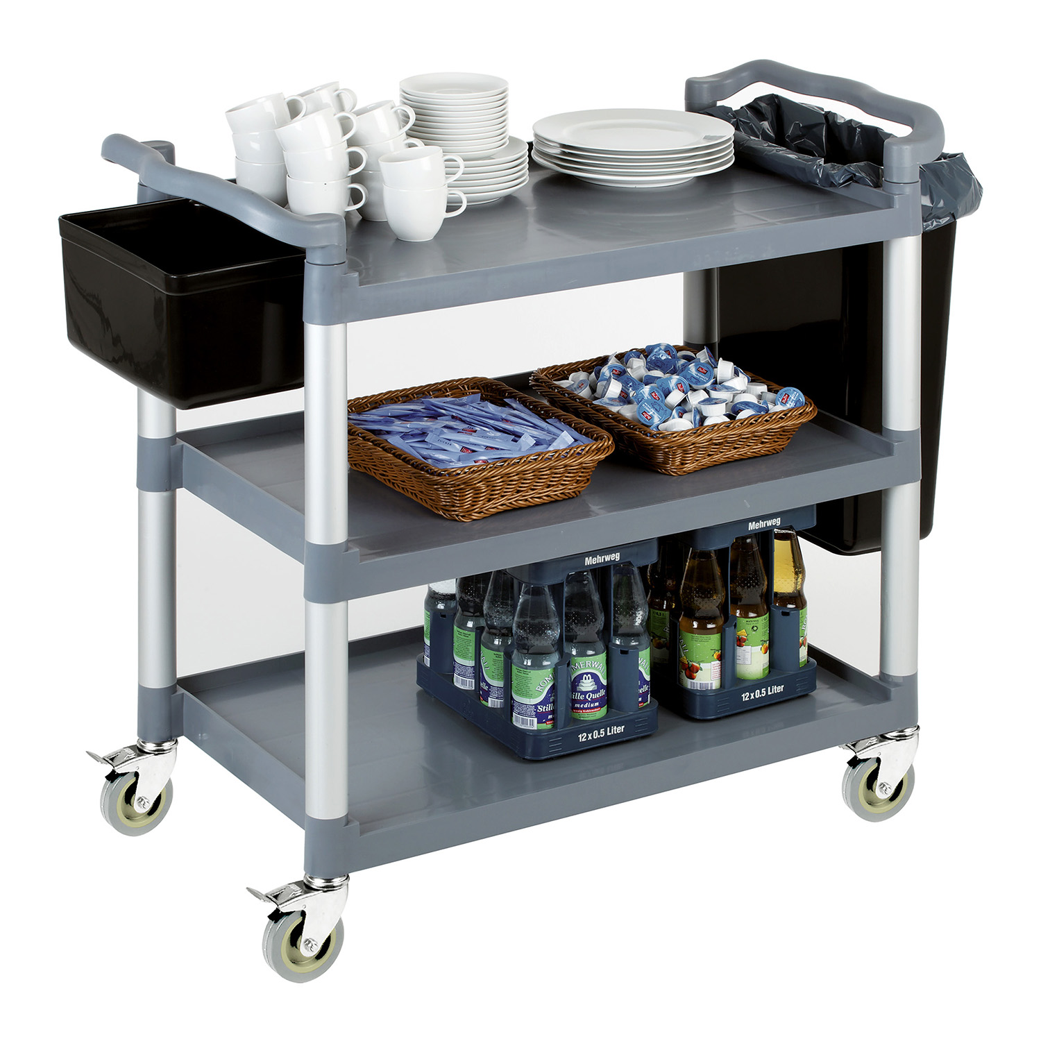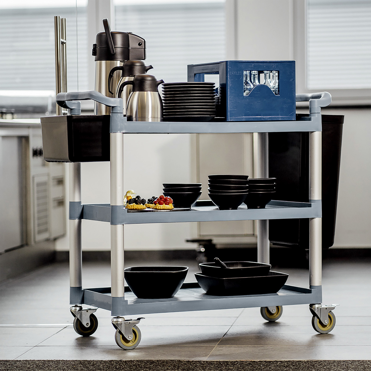 Wózek kelnerski to solidne i bardzo praktyczne rozwiązanie do restauracji, hoteli oraz cateringu – ułatwia sprawny transport naczyń, potraw, napojów i akcesoriów między kuchnią a salą. Konstrukcja opiera się na ramie aluminiowej oraz 3 wytrzymałych półkach z tworzywa (polipropylen), co zapewnia stabilność przy jednoczesnym zachowaniu lekkiej, łatwej w manewrowaniu formy. Wózek wyposażono w 4 skrętne kółka, wszystkie z hamulcami, dzięki czemu można bezpiecznie zatrzymać go w wybranym miejscu.
